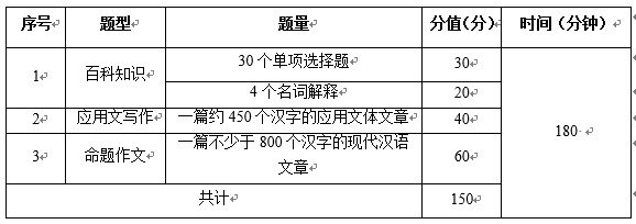 本考试包括三个部分:百科知识、应用文写作、命题作文。总分150分。考试时间180分钟。