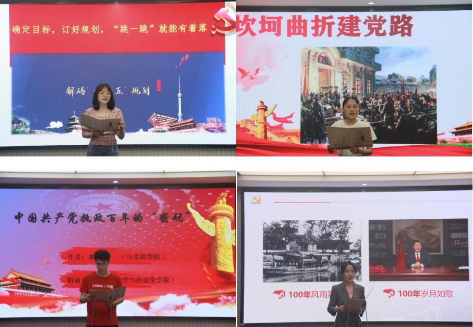 会上,舒莹、杨竹荣、杨森和褚美辰4位同学分别对获奖征文《砥砺奋进“十四五”,实现人生新目标》、《路》、《中国共产党执政百年的“密码”》、《百年大党恰是征途如虹》进行了声情并茂地朗诵展示。