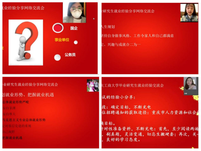 接下来四位研究生同学分享了他们的就业经验。来自文学与新闻学院2017级中国古代文学专业的陈蓉同学以“想考事业单位,如何高效准备”为题分享了成功考取事业单位的经验,她从如何确立目标,到怎么精准报考做了详细的介绍。2017级新闻学的荆笛同学刚从湖北返渝还在集中隔离,以“只要3招,让你在国企招聘中脱颖”为题,讲述了她国企招聘中遇到了众多优秀的应聘者,但她始终用“不惧”二字,在面对未知的领域时不惧,在面对强大的竞争者时不惧,鼓励自己最后成功拿到offer的故事。来自同样专业的郭欣蕊同学向同学们介绍了政府“招才引智”的人才引进计划,为很多不了解这个就业方向的同学们提供了新的就业思路。最后一位2017级马克思主义学院马克思主义中国化研究专业的梁伟杰同学,他认为作为一名党员现在正是面临各种单位招聘党务工作者的大好时机。他希望同学们要认清就业的形势,在国企、央企、私企等各种单位中拓宽自己的就业面,不要错失任何就业的机会。四位同学分别从求职信息渠道、备考经验、心态调整、人生规划等方面做了详尽的分享,在场的同学们对于事业单位、国企以及政府“招才引智”的应聘流程和细节都有了更详细的了解。
