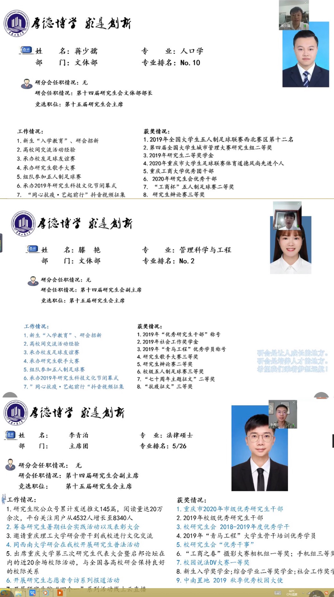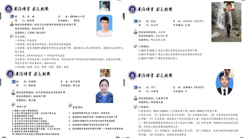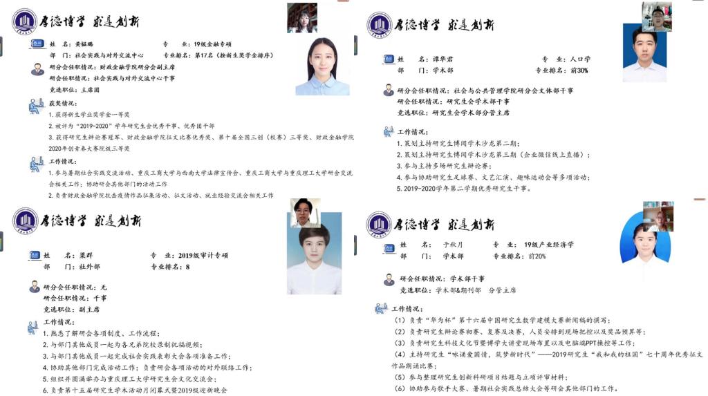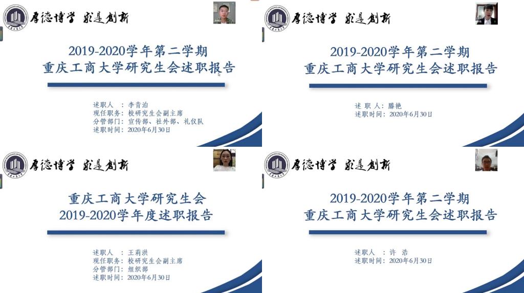 在第十四届研究生会干部工作述职环节,由研究生会主席、四位分管副主席和各部门部长分别就自己的工作内容、工作成效、个人感受和研会展望进行了述职汇报,并对新一届研会发展提出了建设性的意见和建议。