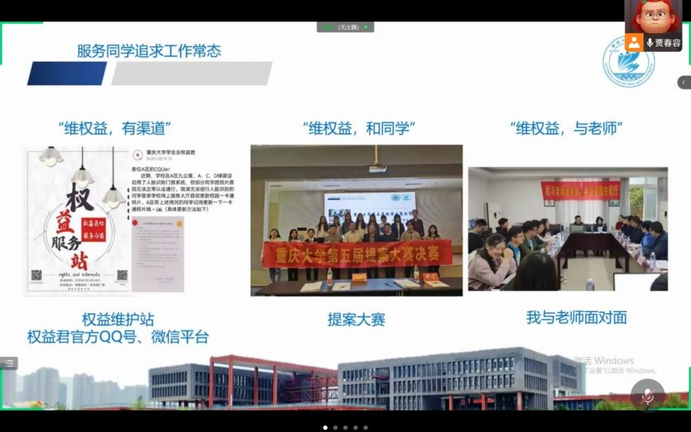 此次培训会内容丰富充实,团市委“青年讲师团”成员、重庆红岩联线文化发展管理中心副研究馆员王春山围绕党的十九届六中全会精神,对党的十九届六中全会精神进行了全面宣讲和系统解读,以宏大的历史视野回顾党走过的百年历程;市教委宣教处负责人程轶针对防范化解涉团学领域风险专题对同学们进行了培训,强调要坚持底线思维,增强忧患意识,准确把握当前国内外形势发展变化,着力提高防范化解重大风险的能力和水平,善作善成,坚决打赢打好防范化解重大风险攻坚战;市团校党委委员、副校长唐树森讲述了党的青年运动史;重庆师范大学学生心理健康与咨询中心副教授、硕士生导师陈娟分别从“什么是心理健康以及标准”、“心理健康知多少”和“心理危机处理及案例分享”三个方面展开讲述;重庆大学学生会主席团成员王芊芊、重庆医科大学研究生会主席团成员陈司南、重庆工业职业技术学院学生会主席团成员晏瑞三位同学分别分享了各自学校开展“我为同学做件事”实践活动的优秀经验等。