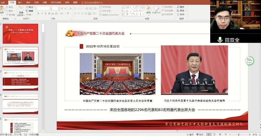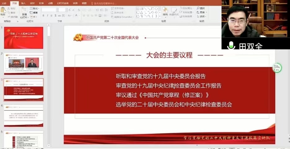 为进一步推动学习贯彻党的二十大精神走深走实,12月14日下午,开云官网在线登录入口网页版 党委研工部组织开展了党的二十大精神线上宣讲会,由研究生院院长、党委研工部部长田双全主讲,校研究生会、研究生自律委员会、研究生“三助”管理服务中心等150余名研究生代表参加。